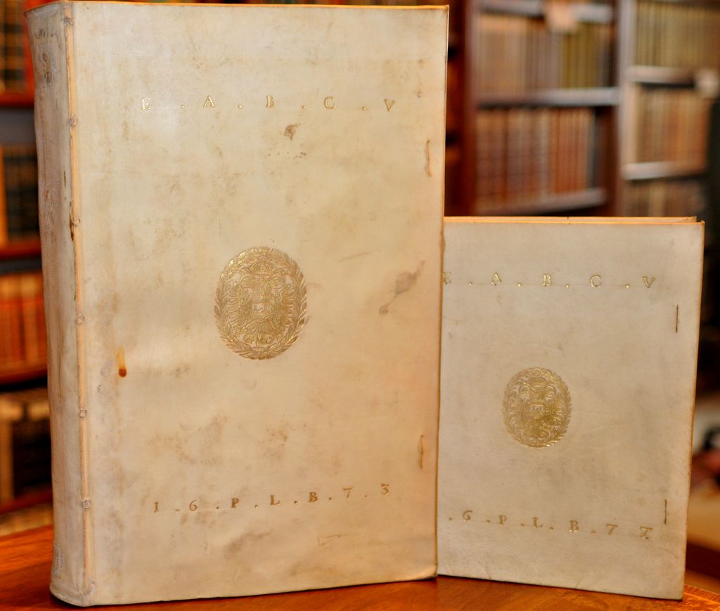 Jelen bejegyzésünk apropóját két olyan hófehér pergamenbe kötött, préselt-aranyozott címerrel és feliratokkal ékesített könyv adta, melyek eredetileg I. Lipót magyar király (ur. 1657-1705) és német-római császár saját gyűjteményének részei voltak, de végső otthonukat Bécs után Kalocsán nyerték el, Kollonitz érsek könyvtárában.