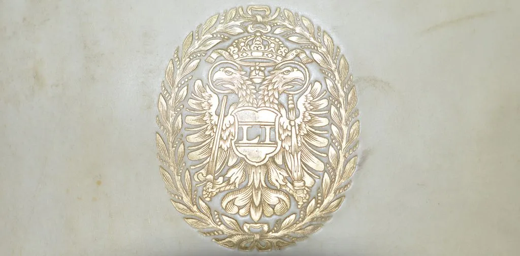 Az első kötéstábla mértani középpontjába illesztett, kétfejű sast és „LI” rövidítést (Leopoldus I.) magába foglaló címere nem sok kétséget hagyott a könyvek egykori tulajdonosa felől. További megfejtésre szorultak viszont a címer fölött és alatt azonos távolságokra elhelyezett „E. A. B. C. V.” és „P. L. B. „ feliratok, így felvettük a kapcsolatot az Osztrák Nemzeti Könyvtár (ÖNB) segítőkész munkatársaival.